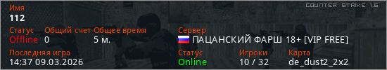 Играет на Counter Strike 1.6 сервере. Страна: РоссияПервый раз замечен 14:33 09.03.2026