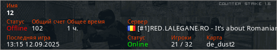 Играет на Counter Strike 1.6 сервере. Страна: РумынияПервый раз замечен 22:03 27.05.2022