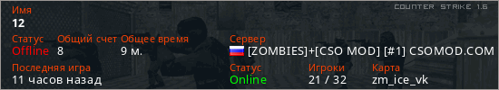 Играет на Counter Strike 1.6 сервере. Страна: РоссияПервый раз замечен 14:23 07.11.2025