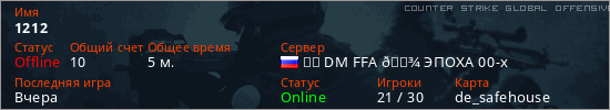 Играет на Counter Strike Global Offensive сервере. Страна: РоссияПервый раз замечен 09:41 06.03.2026