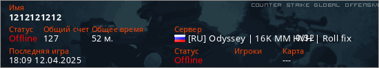 Играет на Counter Strike Global Offensive сервере. Страна: РоссияПервый раз замечен 18:08 11.04.2025