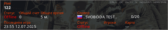 Играет на Call of Duty 4: Modern Warfare сервере. Страна: РоссияПервый раз замечен 23:53 12.07.2025