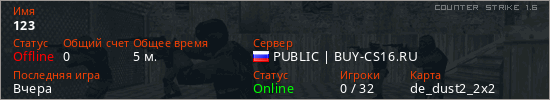 Играет на Counter Strike 1.6 сервере. Страна: РоссияПервый раз замечен 19:51 15.03.2026