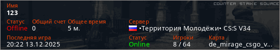 Играет на Counter Strike Source сервере. Страна: РоссияПервый раз замечен 20:14 13.12.2025