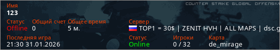 Играет на Counter Strike Global Offensive сервере. Страна: РоссияПервый раз замечен 21:18 31.01.2026