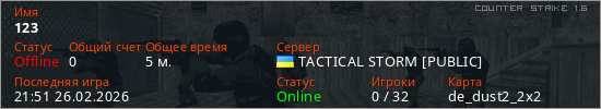Играет на Counter Strike 1.6 сервере. Страна: УкраинаПервый раз замечен 21:47 26.02.2026