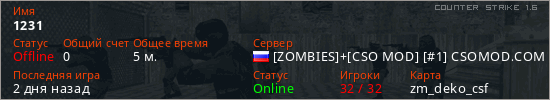 Играет на Counter Strike 1.6 сервере. Страна: РоссияПервый раз замечен 14:06 17.02.2026
