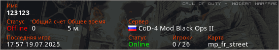 Играет на Call of Duty 4: Modern Warfare сервере. Страна: РоссияПервый раз замечен 17:40 19.07.2025