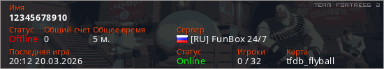 Играет на Team Fortress 2 сервере. Страна: РоссияПервый раз замечен 19:49 20.03.2026