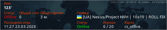 Играет на Counter Strike Global Offensive сервере. Страна: УкраинаПервый раз замечен 11:27 23.03.2026