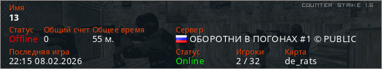 Играет на Counter Strike 1.6 сервере. Страна: РоссияПервый раз замечен 21:32 08.02.2026