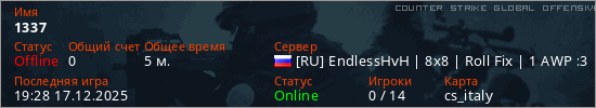 Играет на Counter Strike Global Offensive сервере. Страна: РоссияПервый раз замечен 18:23 17.12.2025
