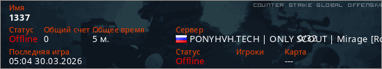 Играет на Counter Strike Global Offensive сервере. Страна: РоссияПервый раз замечен 04:33 30.03.2026