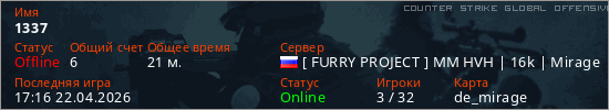Играет на Counter Strike Global Offensive сервере. Страна: РоссияПервый раз замечен 22:59 15.04.2026