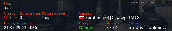 Играет на Counter Strike Source сервере. Страна: РоссияПервый раз замечен 21:27 29.03.2026