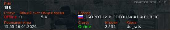 Играет на Counter Strike 1.6 сервере. Страна: РоссияПервый раз замечен 15:51 26.01.2026
