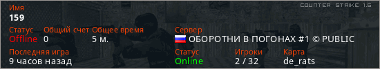 Играет на Counter Strike 1.6 сервере. Страна: РоссияПервый раз замечен 22:06 13.02.2026