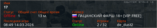 Играет на Counter Strike 1.6 сервере. Страна: РоссияПервый раз замечен 08:07 07.03.2026