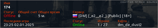 Играет на Counter Strike Source сервере. Страна: РоссияПервый раз замечен 23:13 02.01.2025