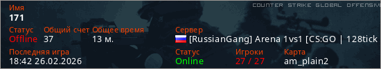 Играет на Counter Strike Global Offensive сервере. Страна: РоссияПервый раз замечен 22:06 17.02.2026