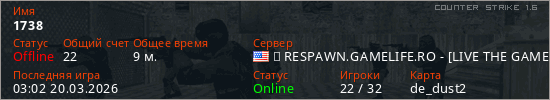 Играет на Counter Strike 1.6 сервере. Страна: СШАПервый раз замечен 22:02 04.03.2026