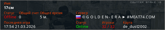 Играет на Counter Strike 1.6 сервере. Страна: РоссияПервый раз замечен 17:48 21.03.2026