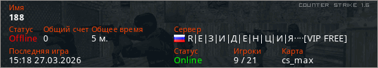 Играет на Counter Strike 1.6 сервере. Страна: РоссияПервый раз замечен 15:16 27.03.2026