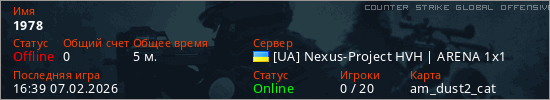 Играет на Counter Strike Global Offensive сервере. Страна: УкраинаПервый раз замечен 16:27 07.02.2026