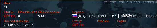 Играет на Counter Strike Global Offensive сервере. Страна: РоссияПервый раз замечен 23:00 08.11.2025