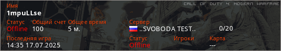 Играет на Call of Duty 4: Modern Warfare сервере. Страна: РоссияПервый раз замечен 14:13 17.07.2025