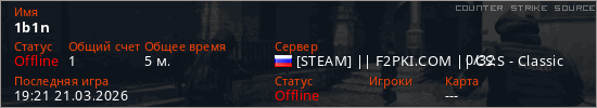 Играет на Counter Strike Source сервере. Страна: РоссияПервый раз замечен 19:19 21.03.2026