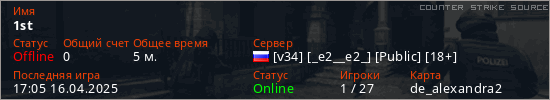 Играет на Counter Strike Source сервере. Страна: РоссияПервый раз замечен 17:02 16.04.2025