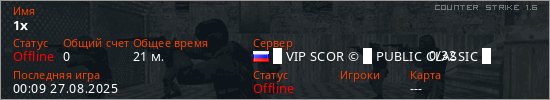 Играет на Counter Strike 1.6 сервере. Страна: РоссияПервый раз замечен 20:12 13.08.2025