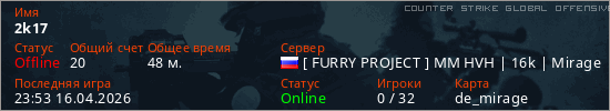 Играет на Counter Strike Global Offensive сервере. Страна: РоссияПервый раз замечен 17:52 10.04.2026