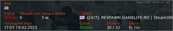 Играет на Counter Strike 1.6 сервере. Страна: СШАПервый раз замечен 17:03 19.02.2025