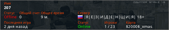 Играет на Counter Strike 1.6 сервере. Страна: РоссияПервый раз замечен 12:06 03.12.2025