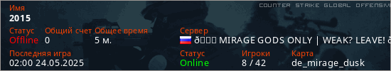 Играет на Counter Strike Global Offensive сервере. Страна: РоссияПервый раз замечен 01:32 24.05.2025