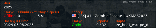 Играет на Counter Strike 1.6 сервере. Страна: СШАПервый раз замечен 03:27 05.08.2025