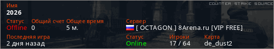 Играет на Counter Strike Source сервере. Страна: РоссияПервый раз замечен 22:27 20.01.2026