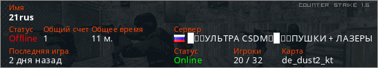 Играет на Counter Strike 1.6 сервере. Страна: РоссияПервый раз замечен 19:58 27.02.2026