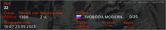 Играет на Call of Duty 4: Modern Warfare сервере. Страна: РоссияПервый раз замечен 11:15 19.02.2025