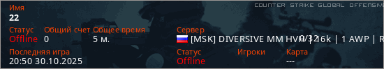 Играет на Counter Strike Global Offensive сервере. Страна: РоссияПервый раз замечен 20:44 30.10.2025