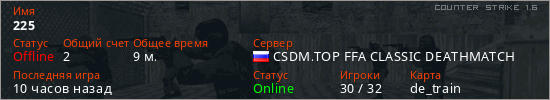 Играет на Counter Strike 1.6 сервере. Страна: РоссияПервый раз замечен 12:08 18.04.2026