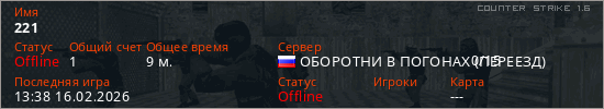 Играет на Counter Strike 1.6 сервере. Страна: РоссияПервый раз замечен 15:11 14.02.2026