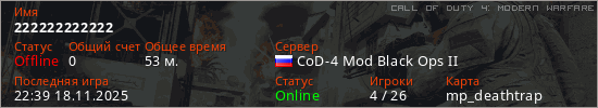 Играет на Call of Duty 4: Modern Warfare сервере. Страна: РоссияПервый раз замечен 12:10 09.04.2025