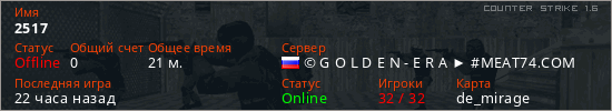 Играет на Counter Strike 1.6 сервере. Страна: РоссияПервый раз замечен 15:54 30.01.2026