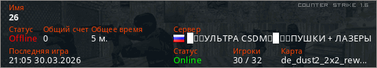Играет на Counter Strike 1.6 сервере. Страна: РоссияПервый раз замечен 20:59 30.03.2026