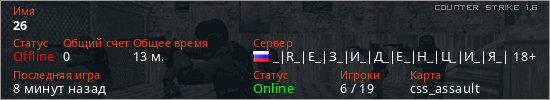 Играет на Counter Strike 1.6 сервере. Страна: РоссияПервый раз замечен 21:35 19.02.2026