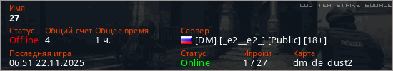 Играет на Counter Strike Source сервере. Страна: РоссияПервый раз замечен 21:40 03.07.2025