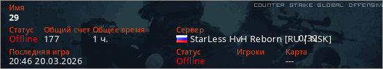 Играет на Counter Strike Global Offensive сервере. Страна: РоссияПервый раз замечен 19:44 12.03.2026